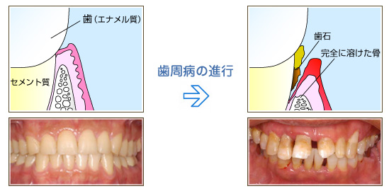 歯周病の原因は、歯に付着した歯垢(しこう)や歯石であるため、それらを取り除かなければ、歯周病の進行を食い止めることは出来ません。